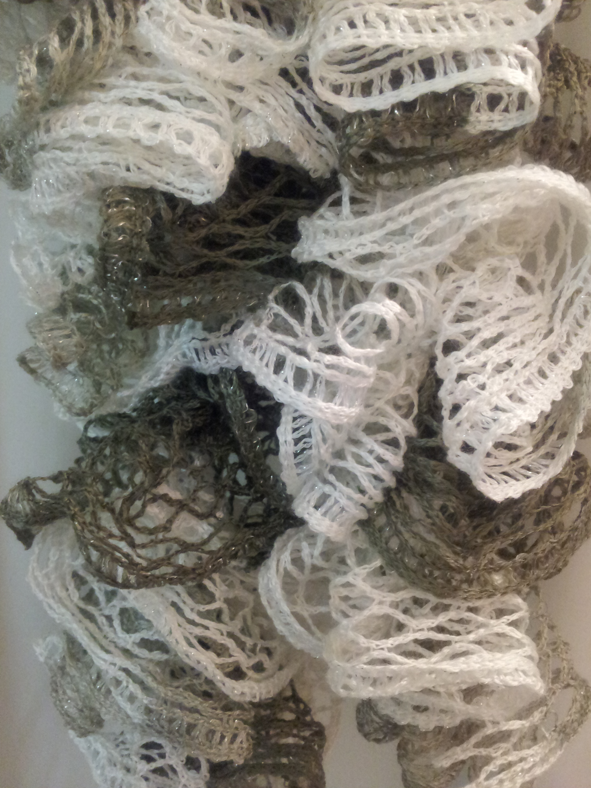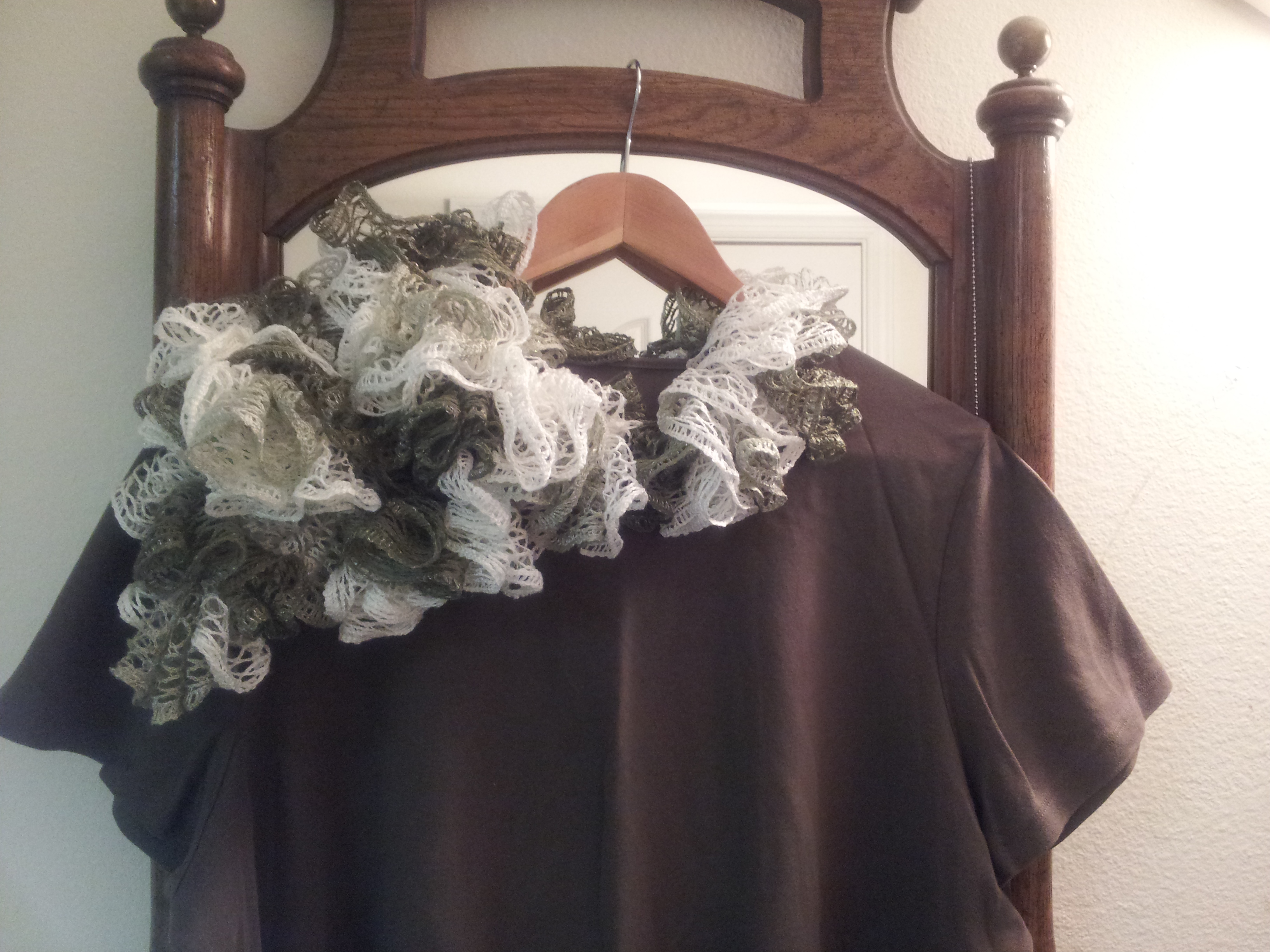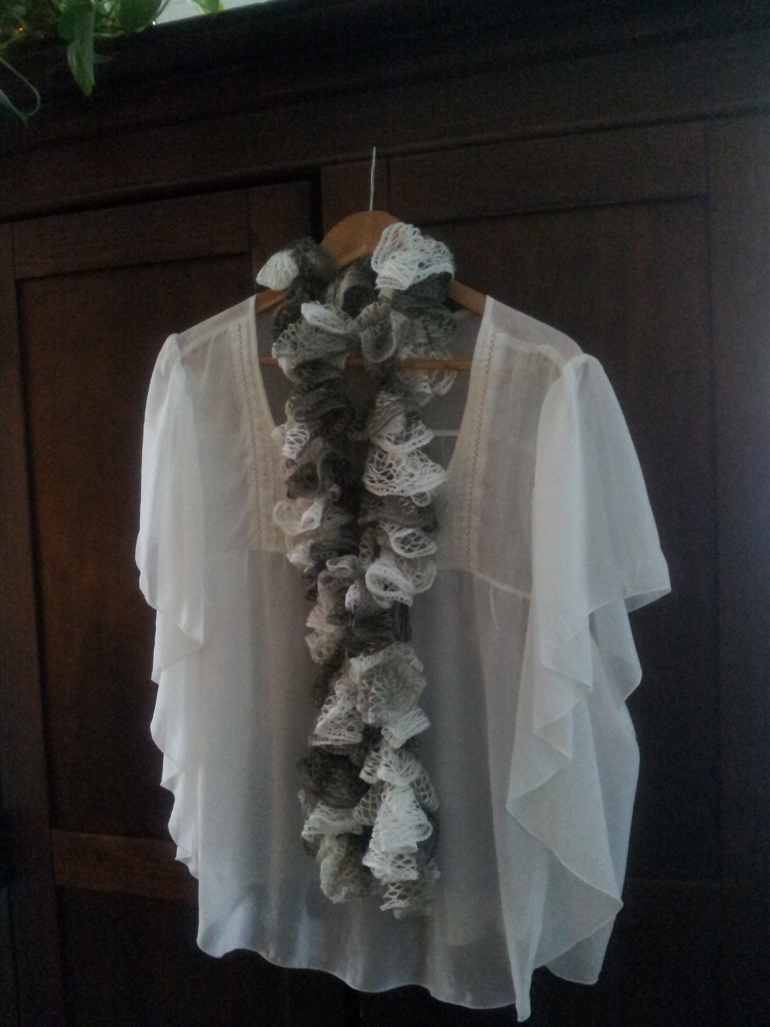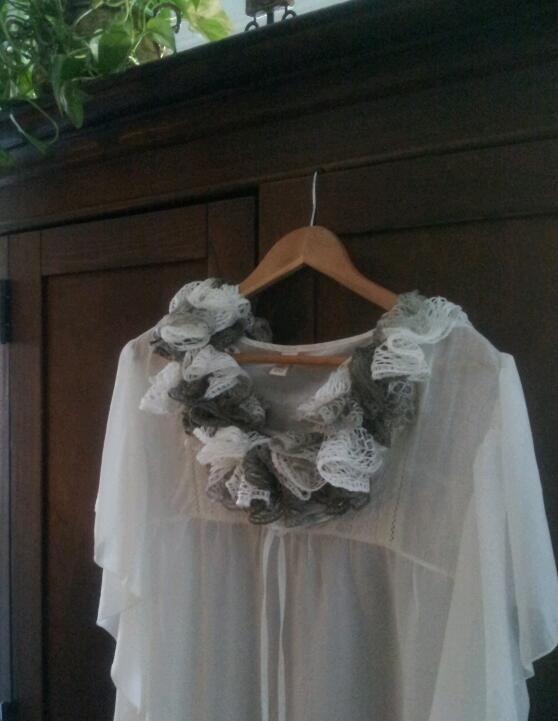 Ruffled crochet scarf / 4 ft long so you can wear it in different styles (see pictures). Handmade.