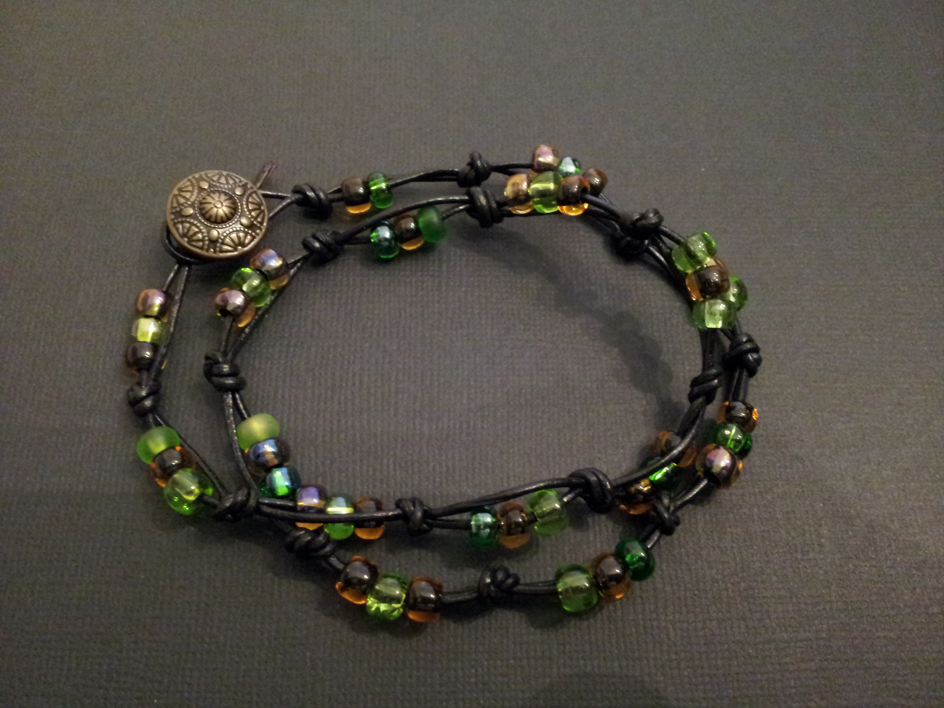 Beautiful handcrafted necklace made with Czech glass beads, leather cord, and up-cycled buttons. Wrap it around your wrist for a great looking bracelet.